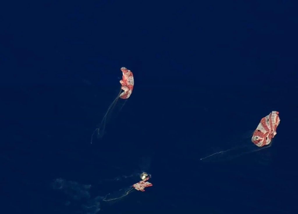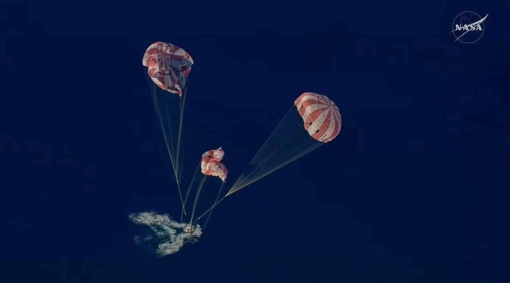 Tras superar esta etapa, la nave amerizó con éxito en aguas del Pacific Ocean, donde pequeñas embarcaciones se dirigieron a la zona prevista para realizar las labores de recuperación de la tripulación.